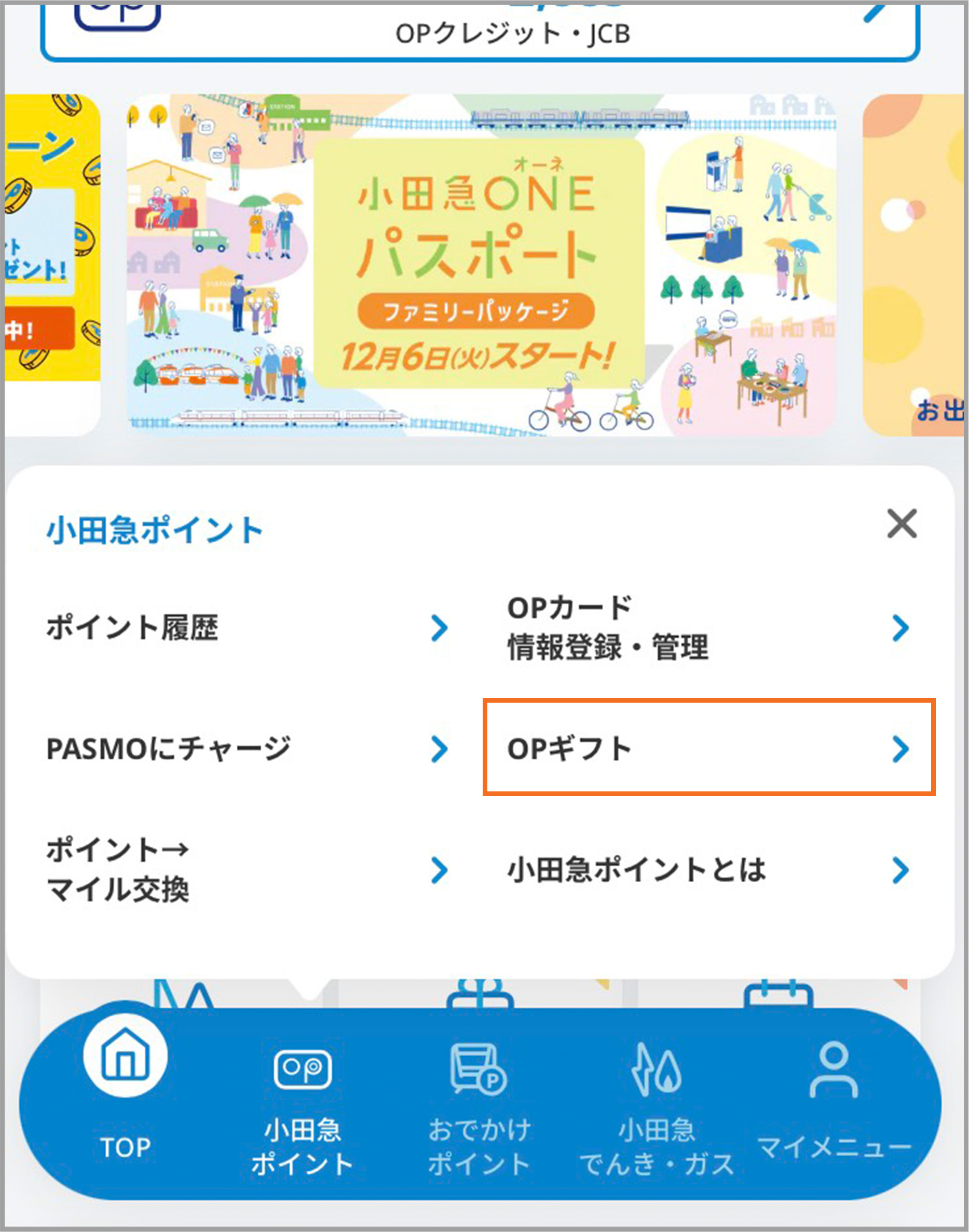 小田急ONE(オーネ)へログイン。メニューから「小田急ポイント」を選択し、「OPギフト」を押してください。