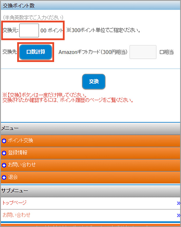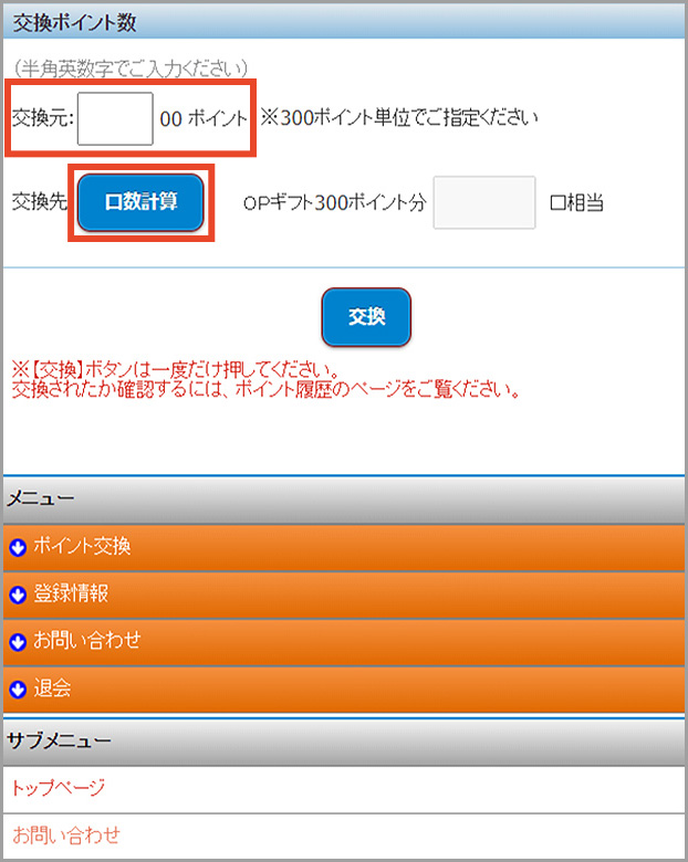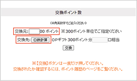 「交換元」欄に交換したいポイント数を入力していただき「口数計算」ボタンを押してください。