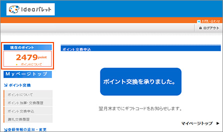 ポイント交換お申込みの翌月末までに、Ideaパレット事務局より交換手続完了のメールをお送りします。